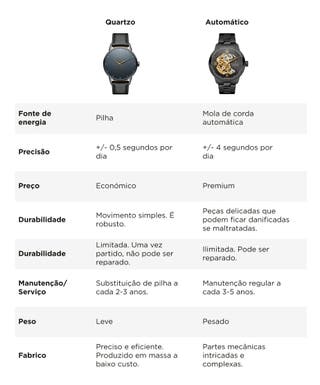 - Vida útil mais curta: Embora precisos, os relógios de quartzo não são concebidos para durar tanto quanto os automáticos.