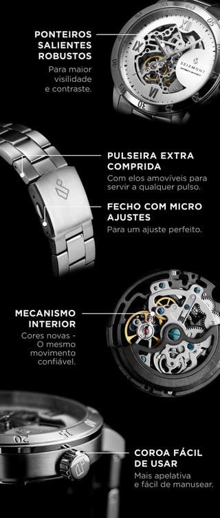 Pediu uma pulseira mais comprida. Está mais comprida. Disse que os ponteiros dificultavam a leitura. Os ponteiros estão agora mais robustos e contrastantes. Referiu que a coroa era difícil de agarrar. É agora mais fácil manipulá-la. De nada.