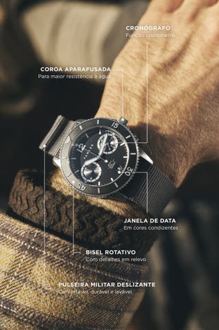 Vidro safira abobadado dos dois lados, 2 pulseiras militares deslizantes incluídas.