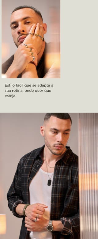 Um relógio elegante, combinado com pulseiras, anéis e colares em aço cirúrgico resistente à água, completa o seu estilo casual.